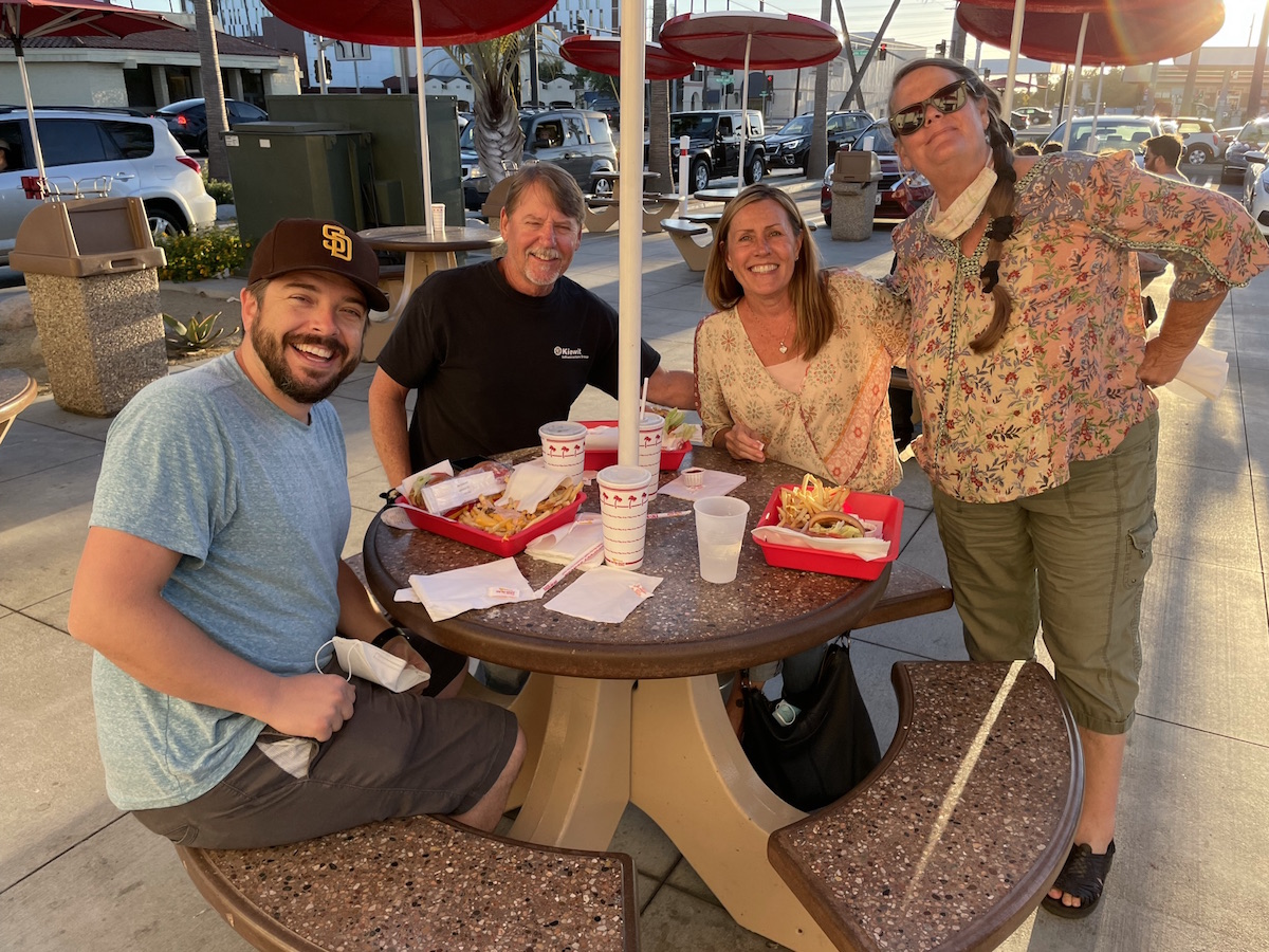 Aunt Cindy picked us up from the baseball game. We were going to meet up with Uncle Brett and Aunt Mary near LAX for a little In N Out dinner before our flight. We had some time to kill, so we went – you guessed it – geocaching near the airport while we waited for them, haha. It was fun! We hung out with the three of them for a few hours before it was time to leave. I’m so glad we got to see some of our California family, even if it was brief. Can’t wait to take the boys out for a full family trip to San Diego and Los Angeles soon.